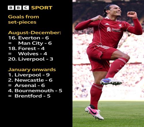 8月-12月期间,利物浦依靠定位球仅3球进账,排名英超垫底。而1月至今,利物浦依靠定位球打入9球,从第20跃升第一!