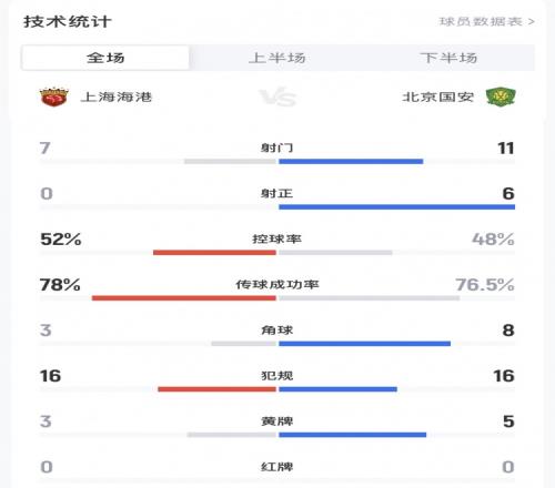 附海港0-2国安全场数据: